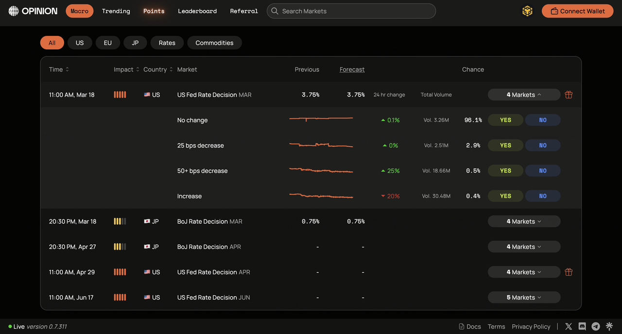 Opinion is a decentralized prediction market that lets you trade directly on real-world events such as interest-rate decisions, inflation data, elections, and crypto news, rather than using noisy proxies like BTC, gold, or stocks. Built initially on the Monad testnet and now launching its mainnet exclusively on BNB Chain, Opinion combines an AI oracle, on-chain orderbook infrastructure, and DeFi-ready contracts to turn economic beliefs into tradeable assets.