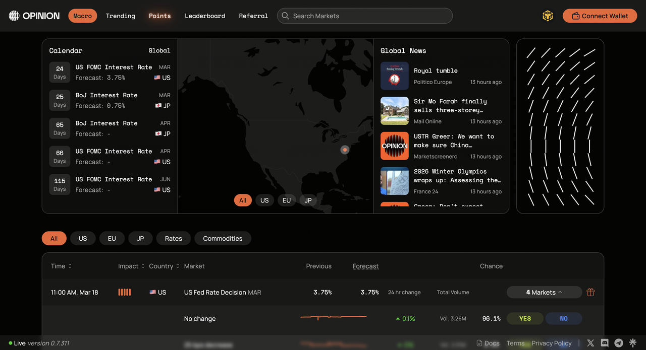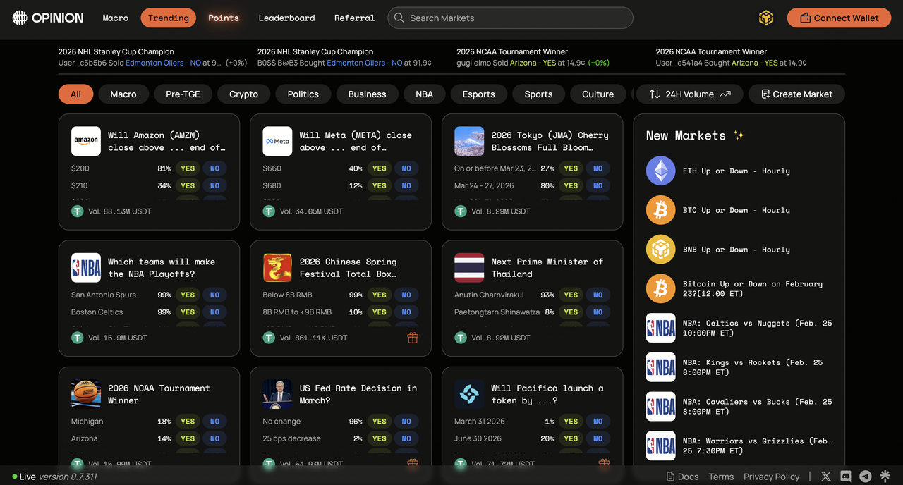 Opinion lets you trade Yes/No markets on macro data, crypto moves, political outcomes, and community events, each with clear rules, transparent AI-oracle resolution, and share prices that reflect the live probability of the outcome.