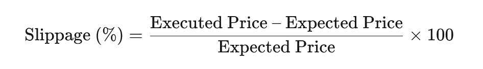 Slippage is usually expressed as a percentage difference between your expected price and the executed price: